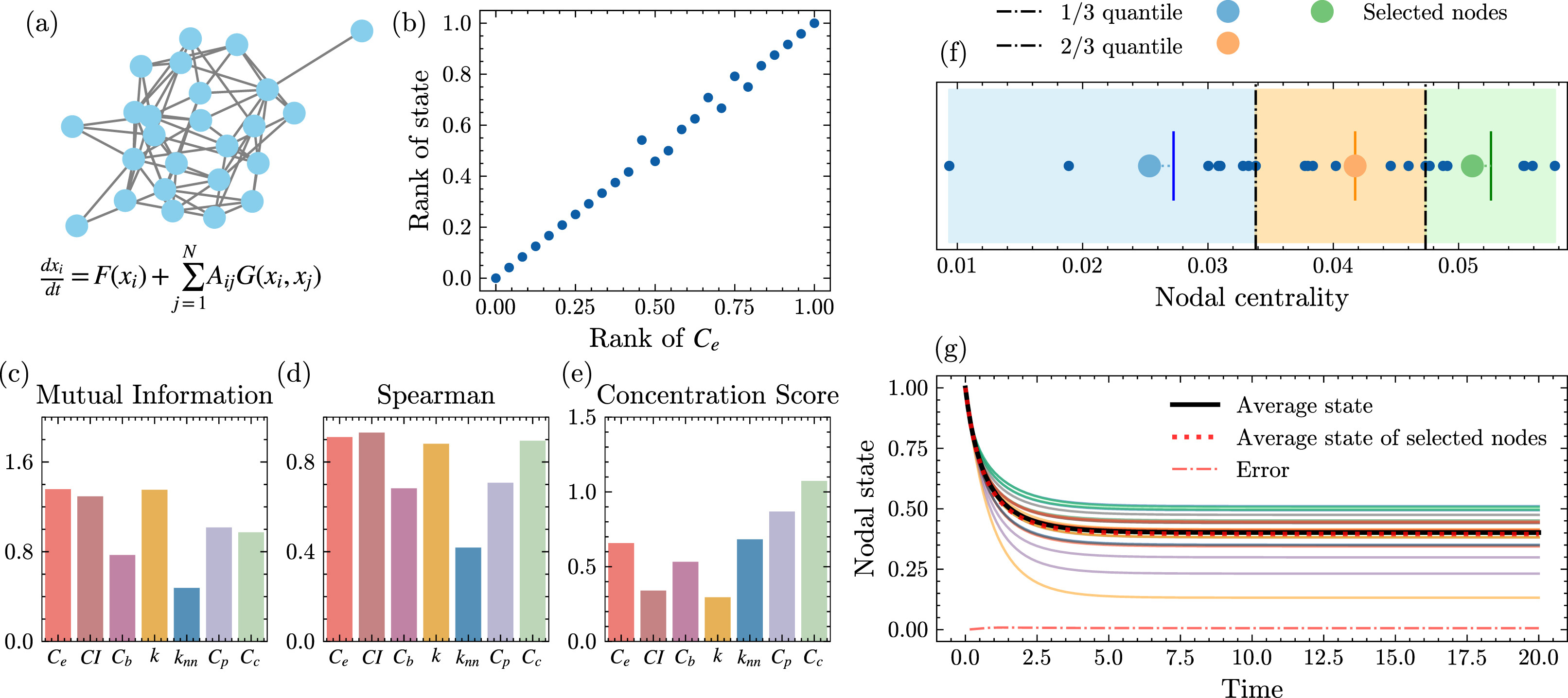 Abstract: Accurately characterizing the state of complex networked dynamical systems is crucial for understanding, prediction, and control of the systems, yet often hindered by the inaccessibility of the states of all nodes in the system. In this work, we introduce centrality-guided node selection strategies, enabling precise approximation of the system-wide average state based on the states of the selected nodes. Remarkably, our approach harnesses solely the structural information of the underlying network and does not require knowledge of the detailed node dynamics. Comprehensive simulations on various empirical networks and dynamic models demonstrate that eigenvector centrality, in particular, offers a robust choice. It yields node collections that reliably capture the global system state with exceptionally low errors, outperforming known strategies based on other measures across interaction topologies, network dynamics, sizes of the observed node set, and different regimes of systems’ dynamics in the parameter space. This work therefore provides a structure-based node selection strategy for efficient and accurate estimations of the global state of complex networked dynamical systems.